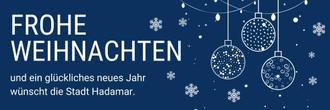Die Mitarbeitenden der Stadt Hadamar wünschen Ihnen und Ihren Familien eine besinnliche Vorweihnachtszeit, ein frohes Fest und viel Glück und Gesundheit für das neue Jahr. Wir sind am 02.01.2024, zu den bekannten Öffnungszeiten wieder für Sie da.