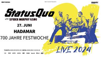 Das Konzert von Status Quo & Spider Murphy Gang am Donnerstag, dem 27.06.2024 auf dem Schlossplatz in Hadamar wird von 19:30 Uhr auf 19:00 Uhr vorverlegt wird.