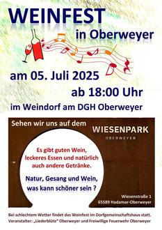 Nach einem Jahr Pause veranstaltet die Liederblüte Oberweyer gemeinsam mit der Freiwilligen Feuerwehr am Samstag, 05. Juli 2025 wieder ein Weinfest in Oberweyer. Nachdem in den letzten Jahren das Weinfest im Garten von Christoph und Sonja Schäfer stattfand, gehen die Veranstalter zurück an den Ursprungsort des Festes. Der neu gestaltete Wiesenpark direkt am Dorfgemeinschaftshaus bietet mit seinem tollen Ambiente für das Fest optimale Voraussetzungen, um Jung und Alt in dem Mehrgenerationenplatz vereint feiern zu lassen. Extra hierzu bauen die beiden Vereine auf dem Platz ein schönes Weindorf auf und werden erlesene Weine aus den Weingütern Dr. Gänz aus Guldenthal an der Nahe sowie Markus Schädler aus Ruppertsberg in der Pfalz anbieten. Wie in den Jahren zuvor wird für das leibliche Wohl bestens gesorgt sein. Zum Essen wird passend ein Winzergedeck, Bratwürste und hochwertige Steaks einer heimischen Landmetzgerei sowie ein veganer Burger angeboten. Eine Hüpfburg bietet neben den vielen neuen Spielgeräten am Wiesenpark viel Abwechslung für die kleinen Gäste. Der Einlass in den Wiesenpark startet um 18.00 Uhr.