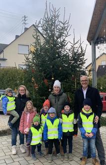 Stellvertretend für die KiTa wurden diese durch den Elternbeirat und einige Kinder entgegen genommen. Bereits zu einem ersten Einsatz der Westen kam es, als die KiTa Kinder fleißig den Baum auf dem Dorfplatz mit ihren selbstgebastelten Anhängern wunderschön geschmückt haben.
