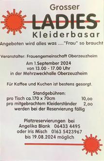 Die Frauengemeinschaft Oberzeuzheim ist Veranstalter des ersten Ladies-Basars am 01.09.2024 in der Mehrzweckhalle Oberzeuzheim. Der Basar findet ab 13:00 Uhr bis ca. 17:00 Uhr statt.