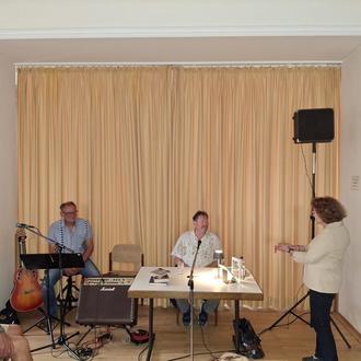 „Es kommt immer was dazwischen“, dies nahm das Team der Bücherei wetterbedingt wörtlich und verlegte die Lesung vom Rosengarten in den Pfarrsaal der katholischen St. Johannes-Nepomuk-Kirche. Bereits in seiner Jugend fand Thomas Uecker, Pfarrer der evangelischen Kirchengemeinde Hadamar, Wege und Möglichkeiten, um dem Liedermacher, Kabarettist und begnadeten Erzähler, Hanns Dieter Hüsch, zu begegnen. Und so motivierten seine Begeisterung und die persönlichen Überleitungen mehr als 100 Zuhörer, sich in Hüsch´s allzu menschlichen Texten wiederzufinden. „Weil aber Jochen Langel, es musikalisch besser kann als er“, so Uecker, begeisterte der Tierarzt aus Hadamar, mit seinem Gesang zur Gitarre. Nicht nur „ Heute hier, morgen dort“ von Hannes Wader oder Reinhard May´s „Über den Wolken…“, trafen punktgenau Hüsch´s Intentionen, sondern auch die Gedanken des Publikums. Umso erstaunlicher waren dann die Köl´schen Lieder, aber auch hier gab es eine Verbindung zu Hanns Dieter Hüsch, der nach dem Tod seiner Frau von Mainz nach Köln umgezogen war. Mit Hüsch´s pointierten Überlegungen zu einer gesunden Ernährung mit viel Obst, Gemüse und eben doch dem Knabberzeug, fühlten sich die Zuhörer verstanden. Nicht nur der Kabarettist Hanns Dieter Hüsch kam zu Wort, sondern auch der protestantische Christ. Und so regte Hüsch´s telefonischer Kontakt zu Gott das Publikum humorvoll zum Nachdenken an. Ging es doch beispielsweise in der Unterhaltung um Weltprobleme oder die Bedeutung von Weihnachten.
