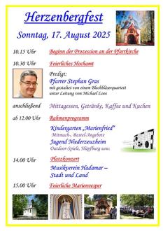 Die Pfarrgemeinde wird den Tag mit der Prozession von der Pfarrkirche St. Johannes Nepomuk Hadamar zum Herzenberg um 10.15 Uhr beginnen. Gegen 10.30 Uhr wird das Hochamt vor der Herzenbergkapelle gefeiert. Die Festpredigt hält Pfarrer Stephan Gras. Der Gottesdienst wird von einem Blechbläserquartett unter Leitung von Michael Loos mitgestaltet. Für die Prozessionsteilnehmer werden Sitzplätze reserviert.