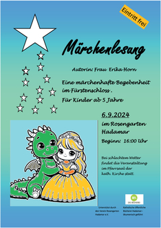 So werden sich alle kleinen und großen Zuhörer in das Fürstenschloss zu Hadamar versetzt fühlen, wo die Märchenprinzessin und ihr kleiner grüner Freund, der Drache, wohnten. Die Beiden trafen sich jeden Tag und verbrachten ihre Zeit gemeinsam mit Spielen, Basteln und auch mit Blödsinn machen. Doch eines Tages wartete der kleine Drache vergebens auf seine Freundin. Auch am nächsten und übernächsten Tag kam die kleine Prinzessin nicht in den Schlosshof.