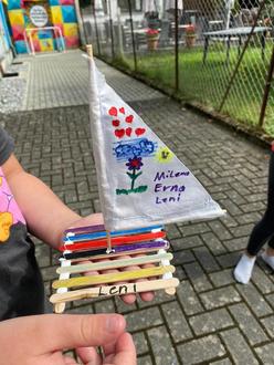Den Mittwoch nutzten wir um in Kleingruppen individuelle Flöße zu erschaffen. Die Kinder waren dazu angehalten selbstständig die Flöße zu kleben, zu verzieren, aber auch das Segel an der Nähmaschine zu nähen. Nachmittags wurden dann gemeinsam noch einige Spiele gespielt, bevor es dann für alle nach Hause ging.