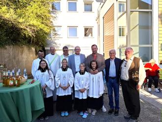 Am Sonntag, 24. August, wurde das neue zentrale Pfarrbüro der katholischen Pfarrei Sankt Johannes Nepomuk in Hadamar eingeweiht. Den Startschuss der Feierlichkeit bildete an diesem Abend ein Gottesdienst. Im Anschluss an die Abendmesse weihte Pfarrer Stephan Gras das neue Verwaltungszentrum ein, welches jetzt den Gemeindemitgliedern aus Ahlbach, Heckholzhausen, Nieder- und Obertiefenbach, Nieder- und Oberzeuzheim, Nieder- und Oberweyer, Steinbach, Hadamar und Niederhadamar zur Verfügung steht. Aus all den Orten waren Gläubige erschienen und die Ortsausschüsse stärkten die Besucherinnen und Besucher mit Speisen und Getränken. Auch Bürgermeister Michael Ruoff sowie die Stadtverordneten Hans Reichwein, Christian Piroth, Heribert Jeck und Eckhard Egenolf (nicht auf dem Foto) waren anwesend und gratulierten zur gelungenen Einweihung. Vor Ort konnten sie sich ein Bild von den modernen Räumlichkeiten machen. Der Bürgermeister betonte die gute Zusammenarbeit und lobte die - nicht nur räumliche - Nähe zum Pfarrbüro. Gleichzeitig konnte Pfarrer Gras auch die neuen Messdienerinnen für die Stadtkirche in ihre neue Aufgabe einführen. Dabei bedankte er sich für die gute Vorbereitung der Messdienerinnen durch Michael Duchscherer und Werner Thomas vom Pastoralteam.
