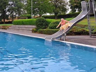 Uwe Kiehl und sein Begleiter Bailey aus Beselich hatten wohl den größten Spaß des Tages, denn sie tobten sogar gemeinsam im Wasser, sprangen vom 1 Meter Sprungbrett und rutschten von der Rutsche. Später berichtete er dem Organisationsteam, dass er schon viel mit seinem Hund erlebt habe, aber das war bisher sein schönstes Erlebnis.