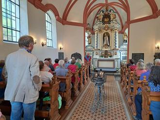 Den Abschluss des Tages gab Referent Dr. Gabriel Hefele, mit seinem Vortrag „You’re My Heart, You’re My Soul - Fürstliche Herzbestattungen in Hadamar“, in der Herzenbergkapelle zum Besten. 1690 ließ Fürst Franz Bernhard den bestehenden Bildstock auf dem Hirschberg zu einer barocken Kapelle erweitern und stiftete einen prächtigen Hochaltar. Neben ihm ließen drei Fürsten ihre Herzen in der Kapelle bestatten, woher sie ihren heutigen Namen „Herzenbergkapelle“ trägt. Vier schwarze Herzen aus Hadamarer Marmor links und rechts des Hochaltars erinnern an die dort noch heute befindlichen Herzen der Fürsten von Nassau-Hadamar. Ein adliges Bestattungsritual, welches erst mit Otto von Habsburg, dem ältesten Sohn des letzten Kaisers von Österreich sein Ende fand. Das Herz von Fürst Johann-Ludwig vertraute er seinerzeit dem Jesuitenordnen an. Als der Orden aufgehoben wurde geriet das Herz in Vergessenheit. Bei Sanierungsarbeit der Pfarrkirche St. Nepomuk wurde es 1964 in einem kleinen Zinksarg wiederentdeckt. Eine Marmortafel erinnert neben dem Hochaltar heute daran.