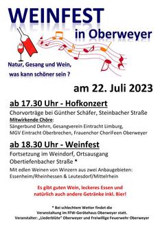 Nach vier Jahren Abstinenz veranstaltet die "Liederblüte" Oberweyer, erstmals wieder erlesene Weine aus den Weinanbaugebieten Essenheim/Rheinhessen und Leutesdorf/Mittelrhein an. Für Nicht-Weintrinker ist ebenfalls bestens gesorgt!