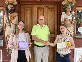 Bürgermeister Michael Ruoff gratuliert Lea Brand (links) und Michelle Baumann (rechts) zur bestandenen Prüfung.