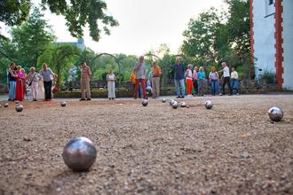 Die Kulturvereinigung hatte sich Unterstützung von der Boule-Gruppe des Turnvereins Offheim geholt und zahlreiche Gäste des Abends waren neugierig auf den typischen Wurf- und Präzisionssport aus dem Nachbarland. Dank der fachgerechten Anleitung entdeckten viele von ihnen eine Sportart für alle Altersklassen, so dass das Boulspiel an diesem Abend zahlreiche neue Freunde gefunden haben dürfte. Wer wollte, konnte aber auch einfach unter der mächtigen Linde auf dem Schlosshof Platz nehmen und von der Auswahl an Weinen kosten, die die Kulturvereinigung eigens aus französischen Anbaugebieten importiert hatte.