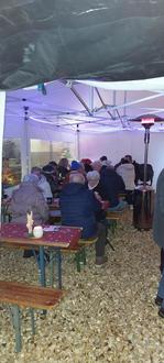 Im festlich geschmückten Festzelt wurden zum Selbstkostenpreis Erbseneintopf, Bratwurst und Waffeln angeboten, ebenso wurde Glühwein, Bier und andere Getränke ausgeschenkt. Für die Kinder kam extra der Weihnachtsmann, und hat diese beschenkt.Wie bei jeder unseren Feiern wurde die Spendenbix zu Gunsten des Hospiz Anavena mit 220 Euro gut gefüllt.