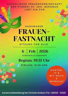 Wie in jedem Jahr laden die Frauen der Katholischen Frauengemeinschaft Hadamar alle Närrinnen und Narren am Freitag, 06.02.2026 in die Stadthalle ein. Mit einem bunten Programm wollen wir Ihnen ein paar fröhliche Stunden bereiten. Die Karten können wie immer telefonisch bei Christel Andres Tel.-Nr. 06433 4332 bestellt werden.