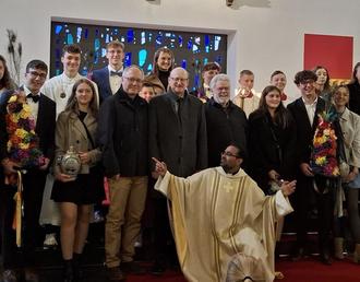 Kirmes in Steinbach – Nach einem feierlichen Kirmeshochamt mit dem Hauptzelebrant Pater Sherin erfolgte der traditionelle Umtrunk mit Kirmesbaumstellen der Mädchen auf dem Kirchenvorplatz. Stadtverordnetenvorsteher Michael Lassmann, Bürgermeister Michael Ruoff und Ortsvorsteher Michael Hoffmann ließen sich den von der Stadt Hadamar mitgebrachten Wein und den Kaffee mit Gebäck vom Ortsausschuss der Kirchengemeinde Steinbach schmecken. In seiner Ansprache dankte der Bürgermeister der Kirmesjugend für ihren Einsatz und lud Nah und Fern zum Steinbacher Markt am Dienstag ein.