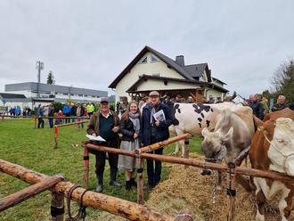 Zu jedem Steinbacher Markt gehört traditionell immer die Prämierung der schönsten Rinder, die aber in diesem Jahr leider ausfallen musste. Die grassierende Blauzungenkrankheit ließ viele Züchter ihre Tiere im heimischen Stall belassen. Den Ausstellenden, die dennoch gekommen waren, kamen große Worte des Dankes zu und jeder erhielt vom Geschäftsführer der Rinderzüchtervereinigung, Heinz-Josef Kremper, eine Teilnahmeschleife. Er stellte wie jedes Jahr mit großer Leidenschaft die gekommenen Zuchtbetriebe und dazugehörigen Tiere vor. Auch die amtierende Milchkönigin Sophia Schäfer aus Fulda sprach ein großes Lob aus. Aus ihrem heimischen Milchviehbetrieb weiß sie wie viel Arbeit in so einer Tierschau für Züchter und Organisatoren steckt. Sie erzählte, dass so eine Viehschau neben der vielen Arbeit, immer aber auch eine gute Möglichkeit bietet die verschiedenen Facetten der Landwirtschaft der Bevölkerung näherzubringen und sich gemeinsam auszutauschen.