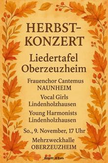 Am Sonntag, den 9. November 2025, lädt die Chorvereinigung Liedertafel 1919 Oberzeuzheim e.V. wieder zu ihrem traditionellen Herbstkonzert in die Mehrzweckhalle Oberzeuzheim ein. Beginn ist um 17:00 Uhr.