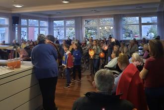 Direkt einen Tag nach St. Martin besuchte der Kinderchor der Pfarrgemeinde Hadamar, unterstützt von Kindern aus der Kita und der Eltern-Kind-Gruppe der AWO die Bewohnerinnen und Bewohner der AWO.Das Licht im voll besetzten Speiseraum wurde etwas gedimmt damit die Laternen leuchten konnten.Die bekannten Martinslieder wurden gesungen, das Mantelteilen vorgespielt, ein Mädchen spielte sogar Solo-Flöte:alle hatten strahlende Augen!