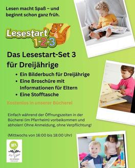 Alle drei Jahre alten Kinder erhalten in der Bücherei ein kostenloses Lesestart-Set, bestehend aus einer Stofftasche und einem altersgerechten Bilderbuch. Auch ältere Kinder, die bisher noch kein Lesestart-Set erhalten haben, sind herzlich eingeladen, sich ein Set abzuholen. Wir freuen uns auch auf Kinder aus den Nachbargemeinden.