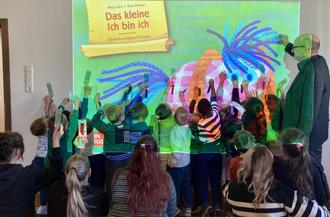 Unsere kleinen Gäste durften im kleinen Sitzungssaal des schönen alten Fachwerkhauses Platz nehmen und gebannt den Worten des Bürgermeisters lauschen. Große Augen machten die kleinen Zuhörerinnen und Zuhörer, als die zu der Geschichte „Das kleine Ich bin ich“ illustrierten Bilder an die Wand projiziert wurden.