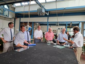 Schulleiter Holger Schmidt und Fachkoordinator Florian Dierig führen die Gruppe um Staatssekretär Dr. Manuel Lösel, Landtagsabgeordneten Christian Wendel, Bürgermeister Michael Ruoff und weiteren Vertretern der Glasfachschule und Technikakademie Weilburg durch die Glasfachschule.