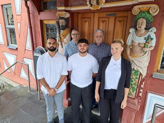 Hauptamtsleiter Rainer Schmidt und Personaldezernent Bernd Groh begrüßen die Neuankömmlinge v.r.n.l. Klara Menze, Lukas Hatzianestis und Shawaiz Ahmad im Alten Rathaus.