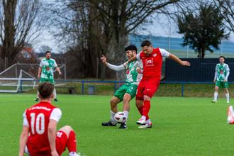 Das Foto zeigt eine Szene aus dem mit 0-1 verlorenen Testspiel bei der SG Mülheim/Kärlich mit Jerome Zey im Vordergrund (Foto von@Jannik Schmidt)