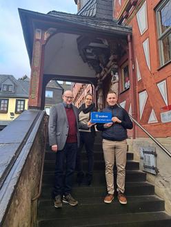 Bürgermeister Michael Ruoff und Nadine Hahn (Stadtmarketing) mit Till Jungmann von Scaboo besiegeln den Startschuss der App für die Stadt Hadamar.