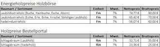 Folgende Holzpreise werden für die kommende Brennholzsaison aufgerufen: