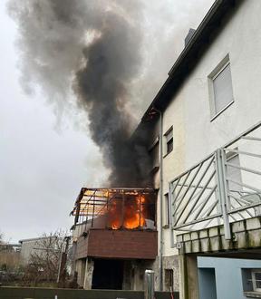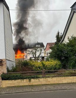 Anbau des Mehrfamilienhauses sowie die angrenzende Brandwohnung im EG bereits in Vollbrand. Flammenüberschlag auf die Wohnung im 1. OG sowie den Dachstuhl des Mehrfamilienhauses.