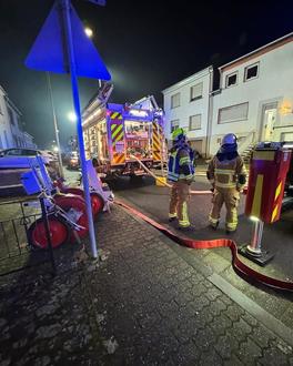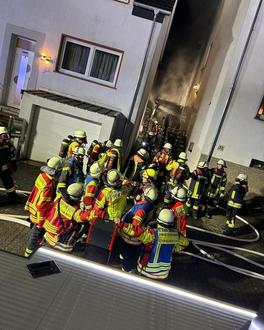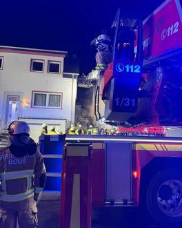 Bei unserem Eintreffen Brandbekämpfung im rückwärtigen Bereich der beiden Wohnanwesen durch mehrere Trupps der Feuerwehr Schwalbach. DLAK in Absprache mit dem Einsatzleiter der Feuerwehr Schwalbach zwischen den beiden betroffenen Wohnanwesen in Stellung gebracht.