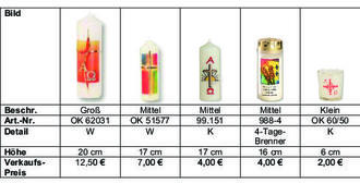 Der Verkauf der Osterkerzen 2023 wird wie in den vergangenen Jahren vor und nach den Gottesdiensten vor Ostern stattfinden: