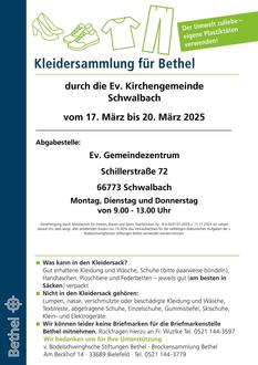 Vom 17. März bis 20. März findet unsere diesjährige Kleidersammlung für Bethel im Ev. Gemeindezentrum in Schwalbach statt. Die Öffnungszeiten sind Montag, Dienstag und Donnerstag von 9.00 Uhr bis 13.00 Uhr.