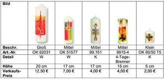 Evtl. werden auch noch Kerzen vor dem Gottesdienst an Ostern verkauft. Der Verkaufsstand befindet sich im hinteren Teil der Kirche unter der Empore. Ein Teil des Verkaufserlöses geht an die Aktion Lebensmittelkorb.