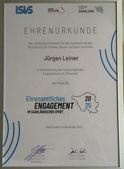 Eine weitere Ehrung wurde ihm vom Landessportverband für das Saarland (LSVS) und dem Ministerium für Inneres, Bauen und Sport zuteil, für sein jahrzehntelanges ehrenamtliches Engagement im Saarländischen Sport. Zum Beispiel: