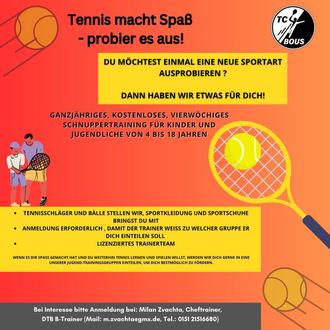 Jeder Tennisinteressierte ist herzlich eingeladen an dem Schnuppertraining teilzunehmen. Unser Trainer Peter Bely führt in die Grundkenntnisse des Tennissports ein und dabei ist ganz egal ob Vorkenntnisse im Sport bestehen oder nicht. Lasst Euch mit dem Tennisfieber anstecken. Es wird um eine vorherige Anmeldung gebeten.