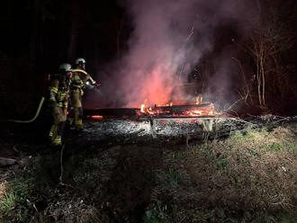 Bei Ankunft an der Einsatzstelle Vollbrand einer bereits teilweise eingestürzten Schutzhütte. Übergriff der Flammen auf die angrenzende Vegetation, keine Personen betroffen.