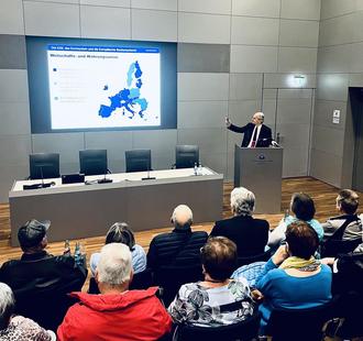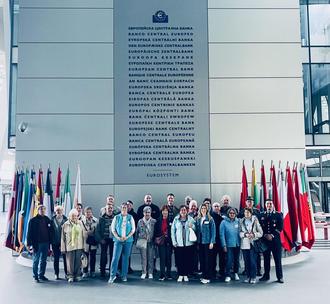 Auf der Tagesordnung stand zunächst ein Besuch der Europäischen Zentralbank (EZB). Nach einer kurzen Sicherheitskontrolle wurde die Gruppe in einem äußerst informativen Fachvortrag über die zentralen Aufgaben und Funktionen der EZB aufgeklärt. Die zahlreichen Fragen im Anschluss machten deutlich, dass das Interesse an der Arbeit der EZB und deren Auswirkung auf die Preisniveaustabilität in der Eurozone groß war.