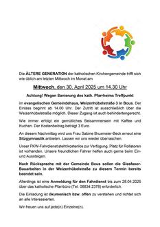 18.30 – 19.30 Uhr Meditationsgruppe im Gemeindehaus Bous