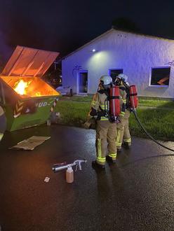 MTW, HLF und TLF zur Einsatzstelle. Polizei ebenfalls auf Anfahrt. Bei Eintreffen Brand eines Großraumcontainers. Brandbekämpfung durch ein Trupp mittels Schnellangriff unter PA. Nach Beendigung der Löscharbeiten, Schaumteppich aufgebracht. Abschließend Kontrolle mittels WBK.