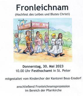 | 10:00 | Bous | Festhochamt für die Pfarreiengemeinschaftmitgestaltet vom Kinderchor der Kantorei Bous-Ensdorf anschließend Prozession im Bereich der Pfarrkirche |