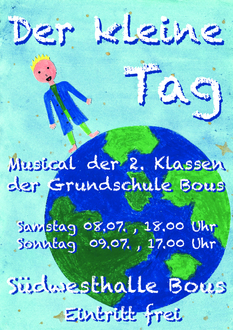 Die zweiten Klassen der Grundschule Bous proben seit 6 Monaten fleißig das Kindermusical „Der kleine Tag“ von Rolf Zuckowski. Sie lernen Texte, Lieder und Choreographien. Die Eltern unterstützen das Projekt tatkräftig mit dem Nähen von Kostümen und Hilfe bei der organisatorischen Planung.