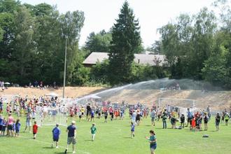 Nicht nur die Teilnehmendenzahl erreichte an diesem Tag einen Rekord, sondern auch die Temperaturen, weshalb sich die Familien mit Sonnenschirmen, Pavillons, Sonnensegeln und Picknickdecken auf dem Gelände niederließen. Gegen die Hitze hatte der SV Bous einen Plan: Mitten im Turnier wurde die Rasensprenger-Anlage eingeschaltet. Binnen Sekunden befanden sich alle 350 Kinder auf dem Platz und sprangen und tanzten für drei Minuten durch die Wasserfontänen – ein Riesenspaß und sicher einer der Höhepunkte der Veranstaltung.