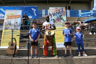 Dede der Trommler bei der Einstimmung zum Turnier mit 3 unserer Minis