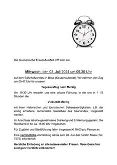 | 9.30 Uhr | Treffen der Ökumenischen FrauenAusZeit am Bahnhof in Bous zum Tagesauflug nach Merzig |