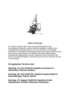 Wir wollen in diesem Jahr wieder einige Gottesdienste in den verschiedenen Ortsteilen unserer Gemeinde anbieten. Auftakt ist der Gottesdienst am 14. Juli um 10.00 Uhr in der Kapelle Laurentius in Hülzweiler.
