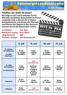 Auch in diesem Jahr haben wir wieder die Predigtreihe in der Region unter dem Titel „Gott im Film“. Beginn ist am 06.07.2025 mit einem Gottesdienst in Bous mit Pfarrerin Ira Köhler.
