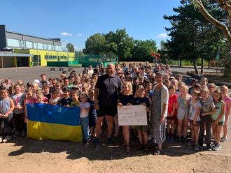 Daher fand am Dienstag, 05.07. auf dem Pausenhof der Grundschule im Beisein aller Schulkinder und unter großem Jubel die Übergabe der Spendengelder statt. Herr Riemenschneider vom Verein Ukraine-Saarland-Berlin e.V. war gekommen, um den Kindern die Arbeit des Vereins zu beschreiben und um anschließend einen Scheck entgegenzunehmen. Auf diesem Scheck stand die unglaubliche Summe von 10.400 € ! So viel wurde noch nie bei einem Spendenlauf eingesammelt. Die Kinder waren und sind zu Recht sehr stolz auf ihre Gemeinschaftsleistung, und uns wurde von Herrn Riemenschneider versichert, dass mit diesem Geld viel Gutes getan werden wird.