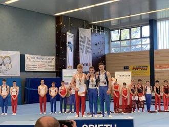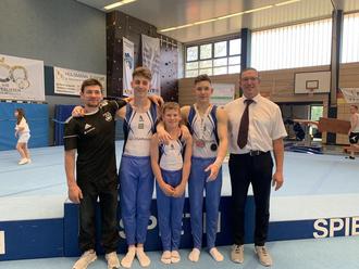 Die drei Turner: Moritz und Max Steinmetz, Maxim Kovalenko, Landestrainer. Waldemar Eichorn, Kampfrichter: Michael Steinmetz