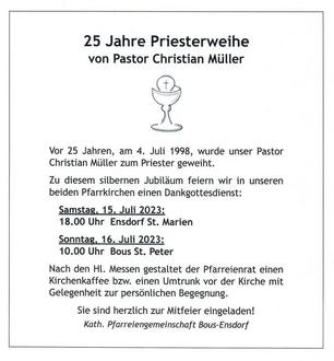 | 18:00 | Ensdorf | Vorabendmesse anschließend Einzelsegen Sonderkollekte für die Pfarrkirche zum Dank anlässlich des 25. Jahrestages der Priesterweihe von Pastor Christian Müller |