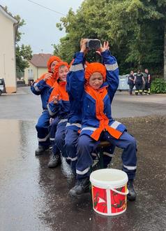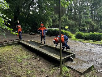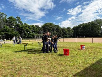 Im Anschluss ging es weiter zur Station vier - dem Schwammparcours. Hier musste mit präparierten Jugendfeuerwehrhelmen Wasser aus einem Brunnen von A nach B befördert werden.